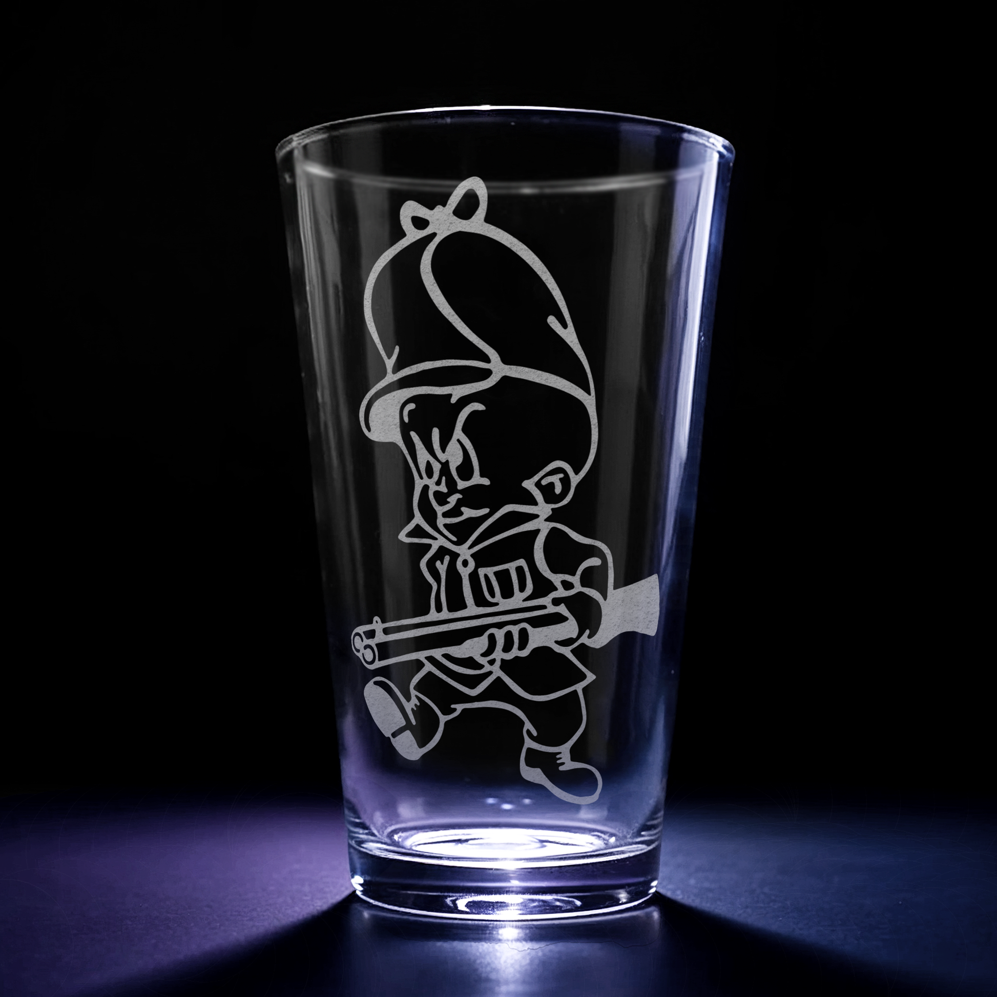 Our durable, temper-rimmed, 16 oz pint glasses are heavy duty, high quality, and dishwasher safe. Each glass is intricately laser engraved, then carefully washed and deburred, ensuring that your design never chips, fades, washes off, or wears away with time and use.